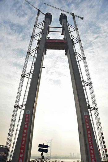 與1#主塔隔江相望的武昌岸2#主塔目前施工已到36節(jié)(共40節(jié),高242米),預計12月底前封頂。主塔封頂后,下步將轉入貓道、纜索系統(tǒng)的施工。