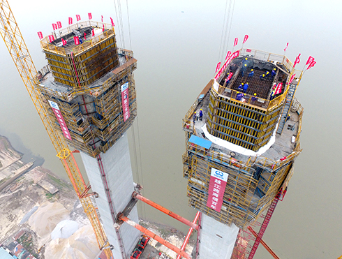 此次完成封頂?shù)?#主塔位于漢陽側江灘,主塔呈下寬上窄的漸變式構造,與長江對岸的2#主塔隔江相望。主塔基礎為沉井基礎,塔柱施工內容主要包括塔座、塔柱、中橫梁和上橫梁及附屬結構。主塔塔身和上橫梁采用鋼筋混凝土結構,中橫梁采用預應力混凝土結構。主塔高231米,共分38節(jié)。兩塔柱的橫向中心距,塔頂為28米,塔底為38米。塔身共澆筑混凝土2.8萬立方米,耗用鋼材4820噸。