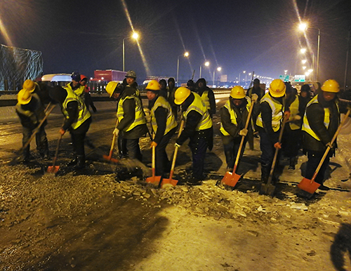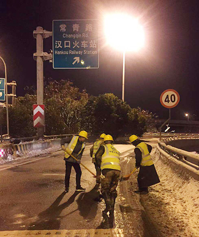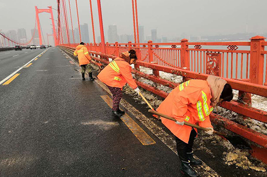 此次低溫雨雪天氣期間,集團公司負責(zé)的12座橋梁、長江隧道、三環(huán)線南、北、東段主道積雪及時清理完畢,交通安全暢通,集團公司及橋建集團、道橋公司、城運公司、新區(qū)公司、城鐵公司、臨空投公司等建設(shè)單位累計組織投入人員5733人次,巡視、撒鹽車輛835車次,鏟車、裝載機、農(nóng)用車242臺次,撒鹽549噸,撒融雪劑64噸,鋪設(shè)草袋10350條,確保了城市三環(huán)線和重要跨江橋梁和長江隧道的安全暢通。