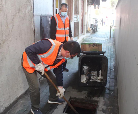10月1日上午,房產(chǎn)集團(tuán)工作人員在管轄的房屋區(qū)域疏通窨井